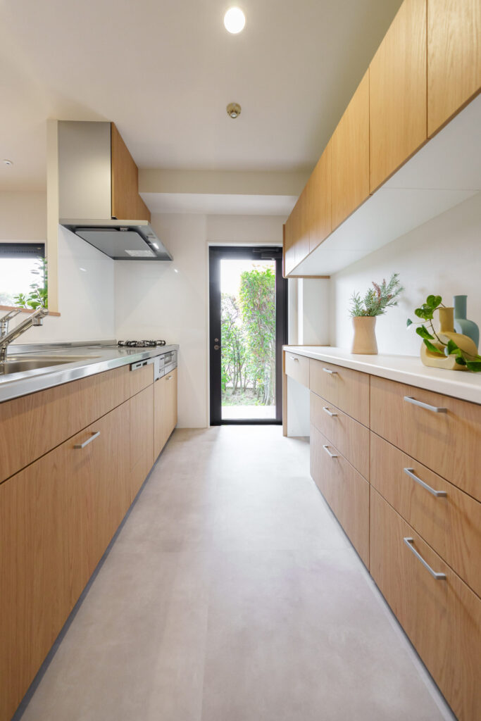 勝手口の先に見えるお庭の緑とも調和していますね!