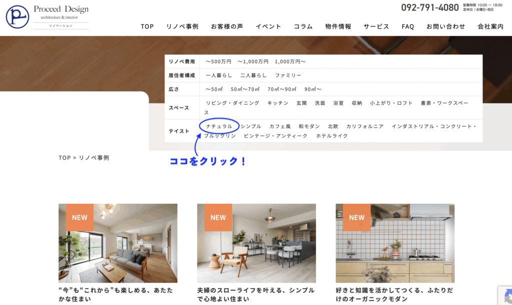 リノベ事例ページトップにある「テイスト」一覧の中から、「ナチュラル」をクリックしていただくと、ナチュラルインテリアの事例がずらりと表示されます♪