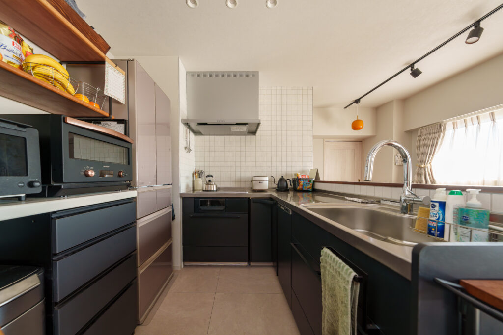 【Mさま】結構片付けましたよ(笑)。でも住む前は「本当はパントリーとかがある方が良かったのかな」と思っていたのですが、意外と必要ありませんでした。L字型のキッチンを選んだのが良かったのかな。このクリナップのキッチンは角の下部分にまで物が入れられるので、収納力はかなり高いです。実はL型の方が、I型のキッチンよりも作業スペースが広く取れるんですよ。その上、動線は短いので家事が楽です。