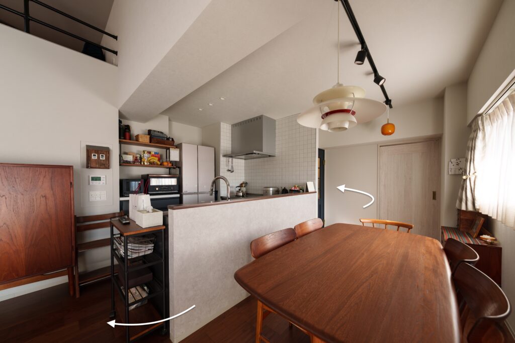 【Mさま】こうしておかなければ、多分移動しづらかったでしょうね。みんなでご飯を食べている時に、ダイニングの後ろを通るのは難しいので、2WAYにしておいて良かったと思っています。わざわざ「どいてー」と言わずにそれぞれ近い出入り口から移動できますから。