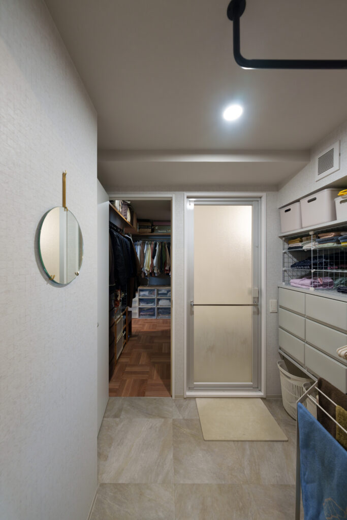 【Mさま】外干しですね。脱衣室の中に物干しバーがあるので、ここで干す作業をして、あとはバルコニーに持っていくだけです。
