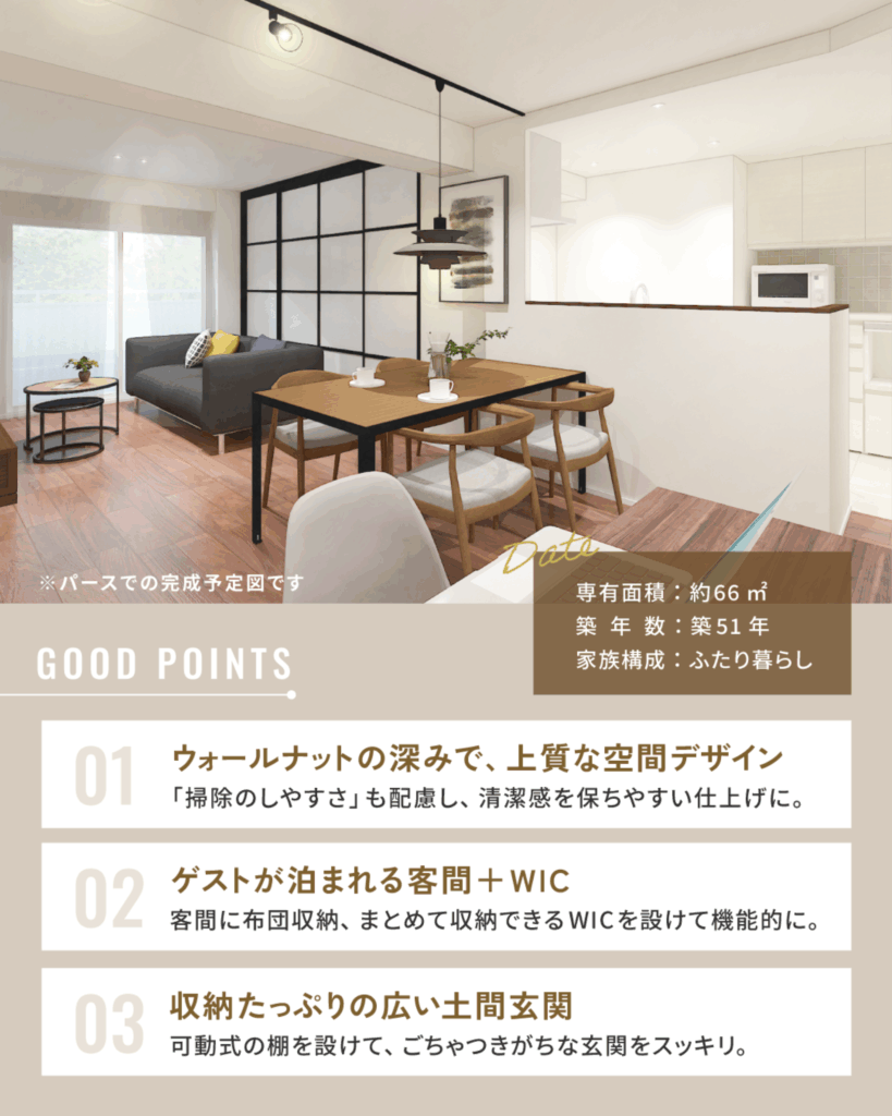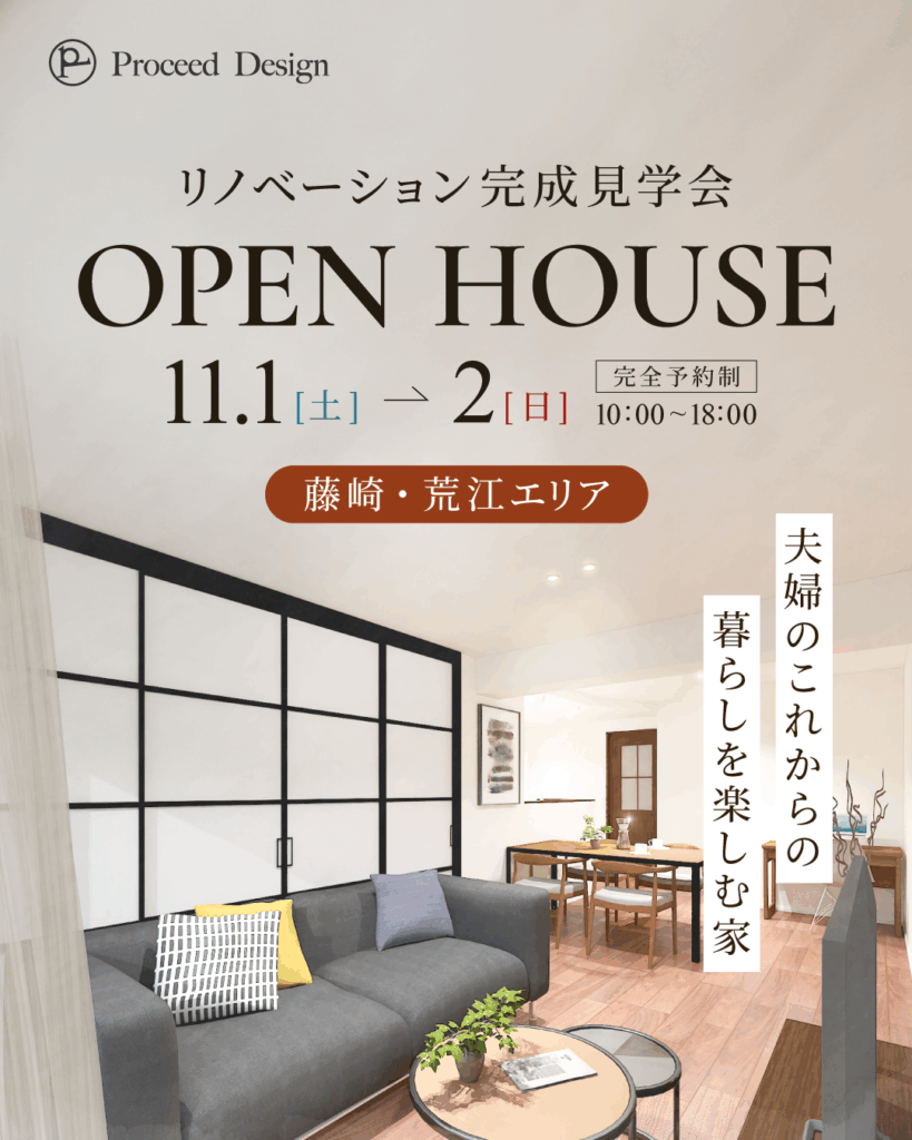 ご定年前のご夫婦が、「これからを見据えた上質な暮らしの住まいを」と始まった中古を買ってリノベの計画。プロシードデザインが物件探しからリノベーションまでワンストップでお手伝いさせていただきました。