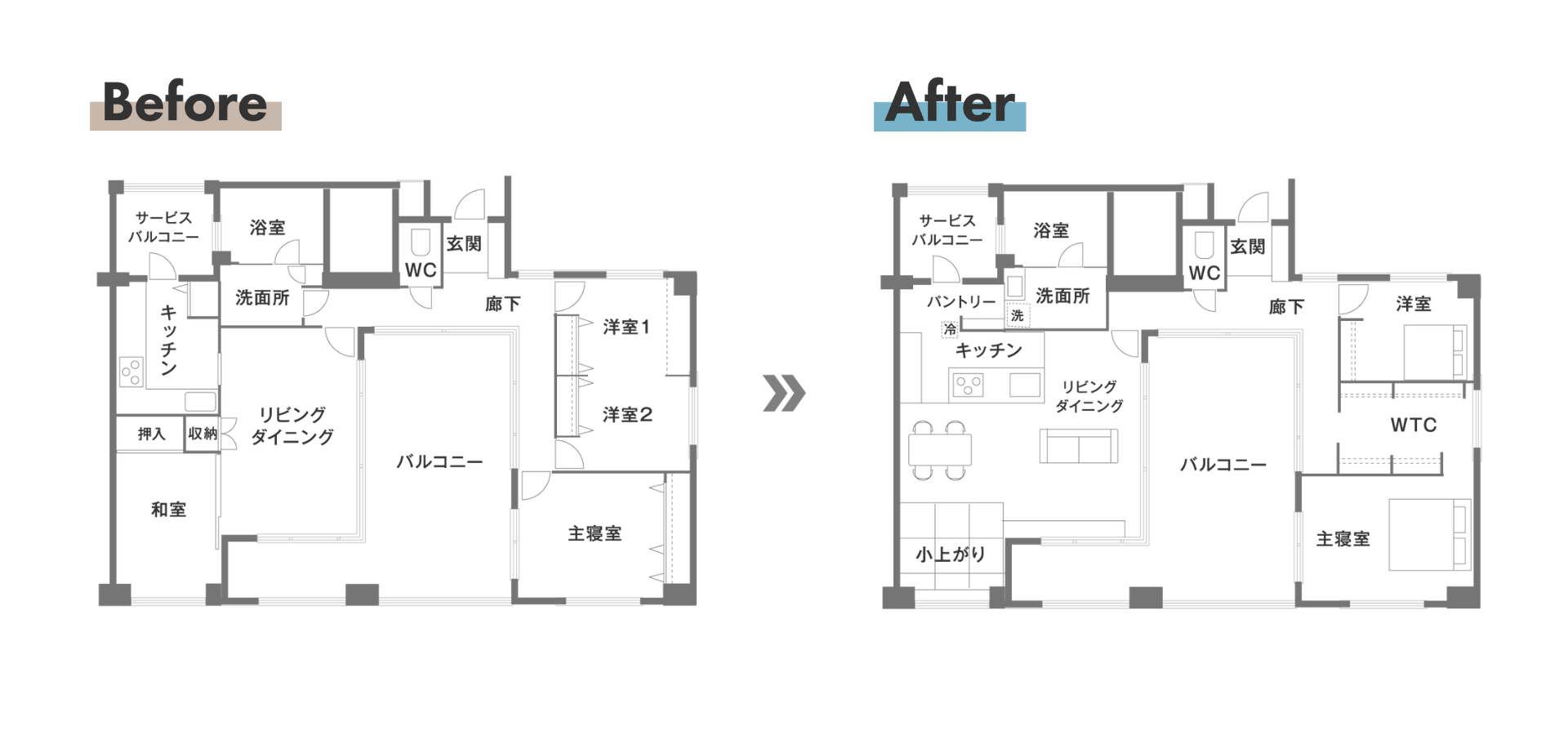 元々のリビング・台所・洋室をLDKへ。1室にまとめると、この開放感です。