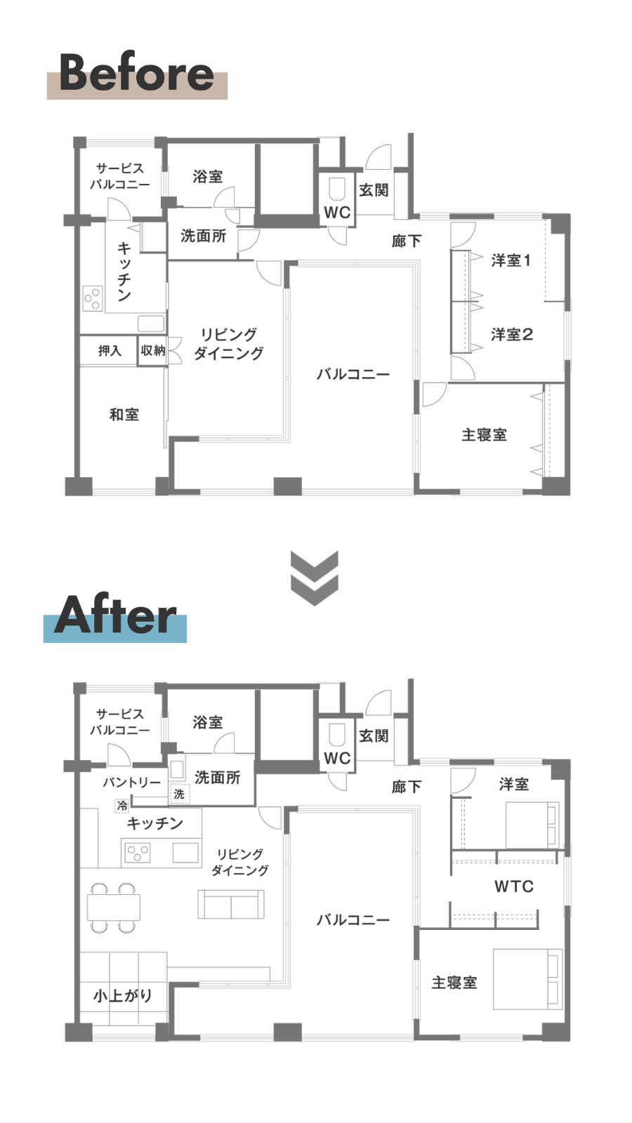 元々のリビング・台所・洋室をLDKへ。1室にまとめると、この開放感です。