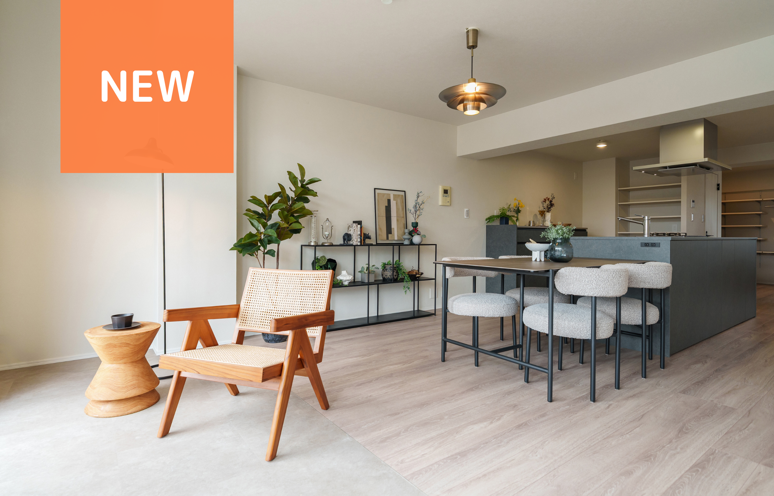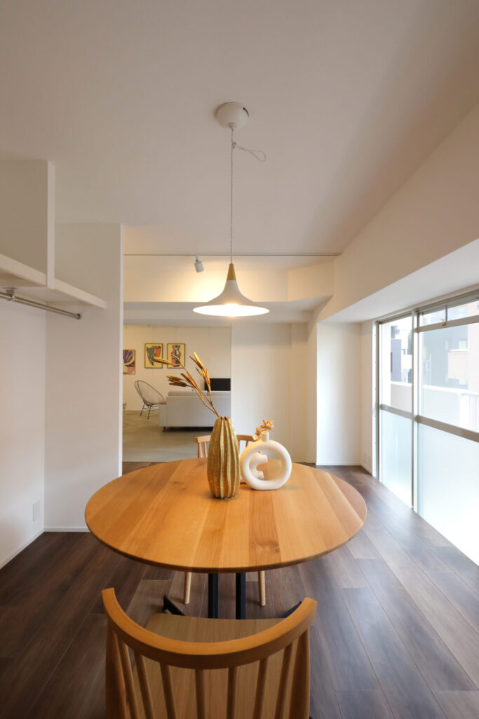 木目調の床と白い壁が響きあい、スタイリッシュな空間に