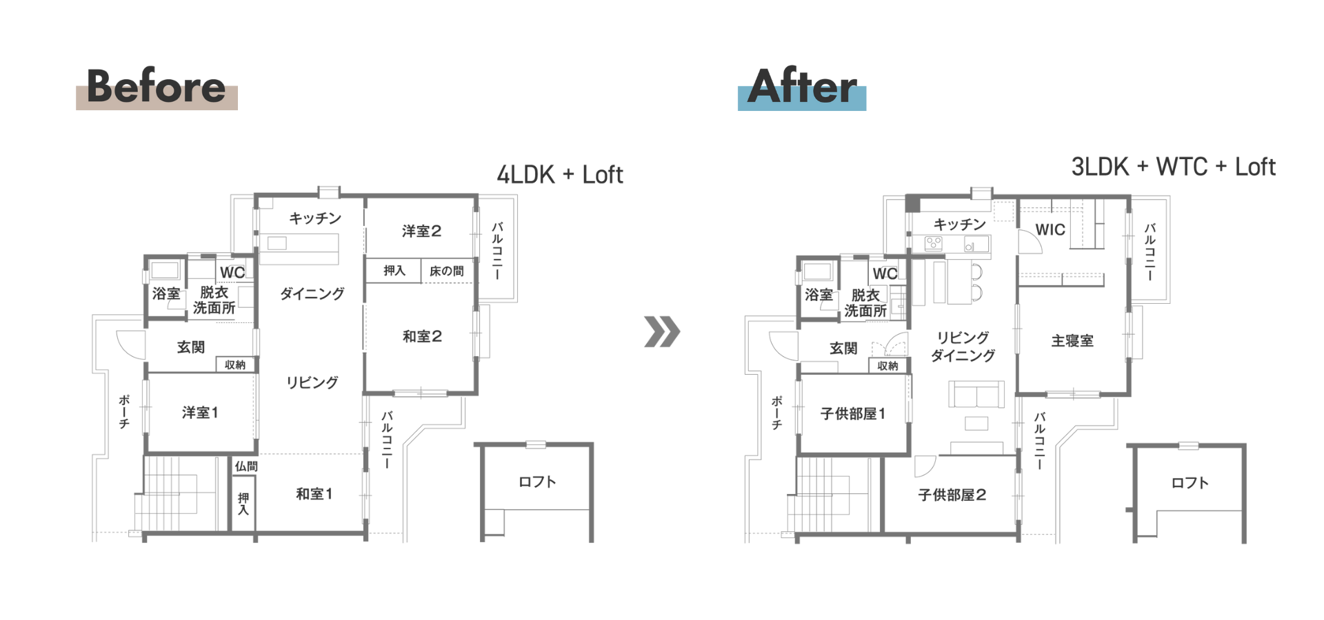 - 4LDK + ロフト ▶︎ 3LDK + WTC + ロフト