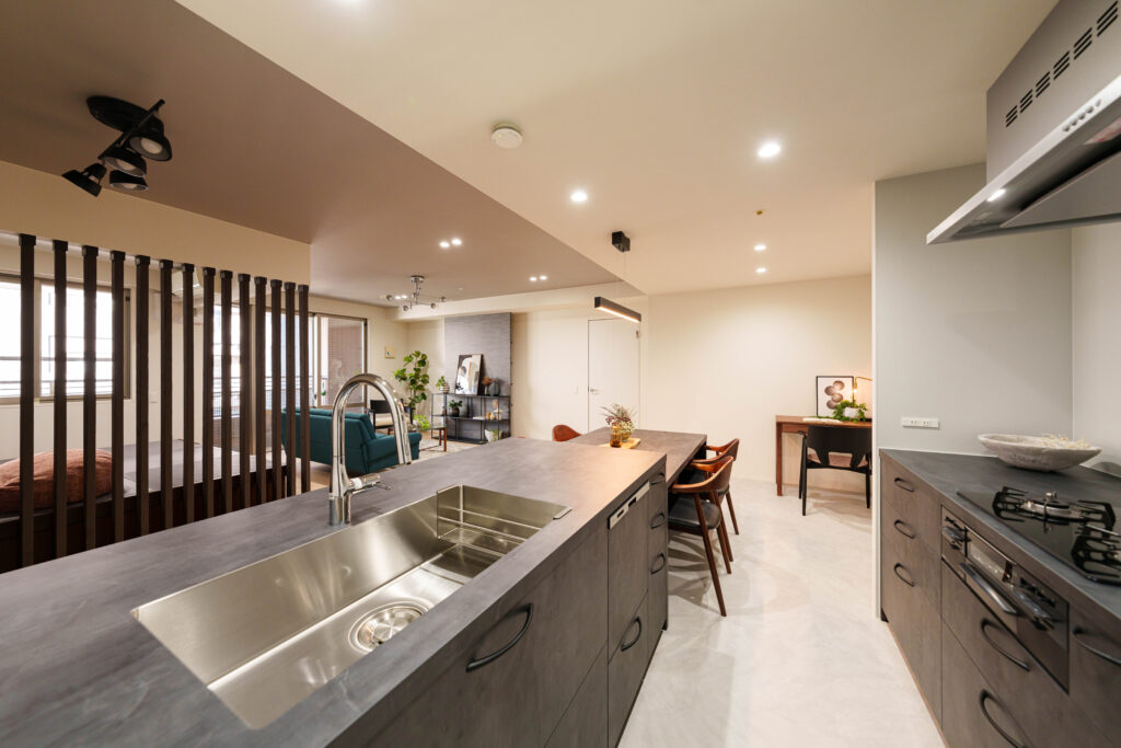 オープンキッチンは、ダイニングと一体型にできる「グラフテクト-デュエ」をセレクト。複数人で料理・⽚付けもできる十分なレイアウトです。