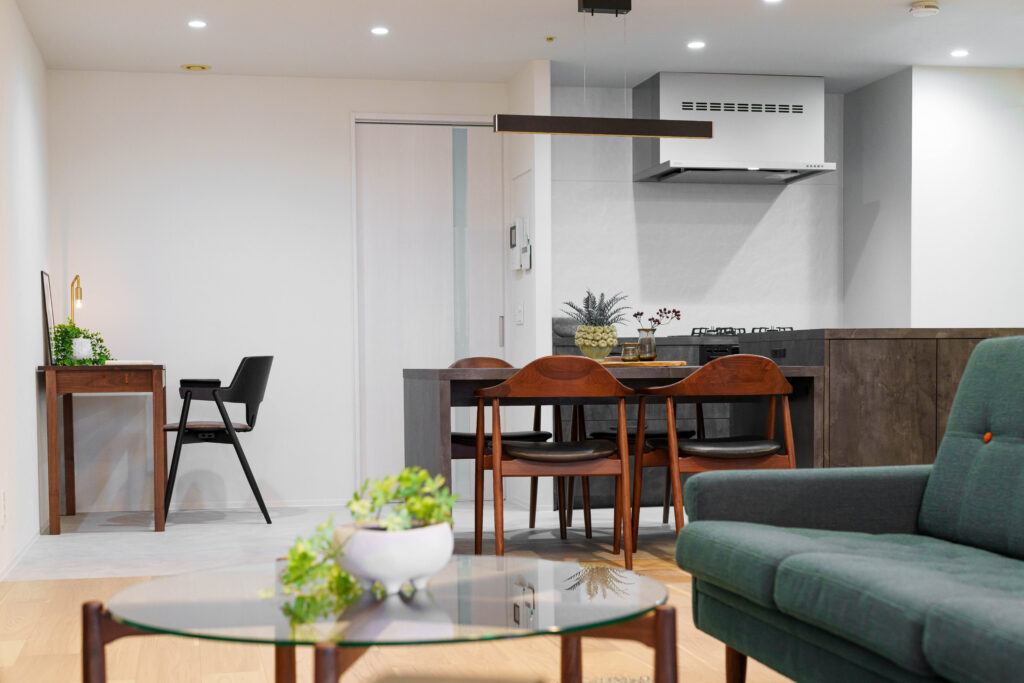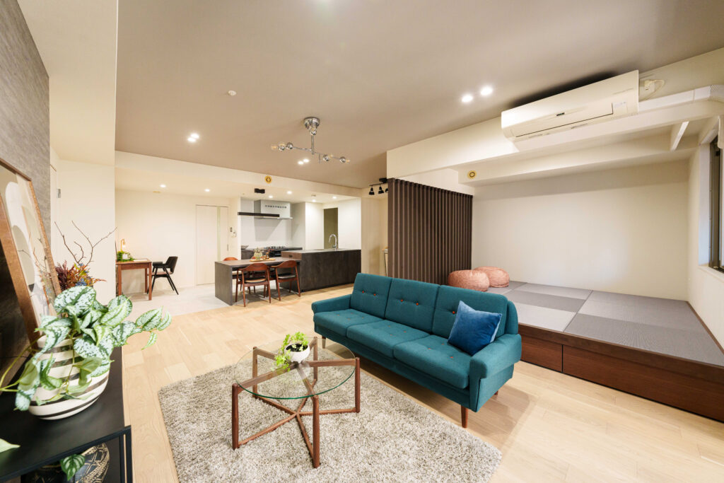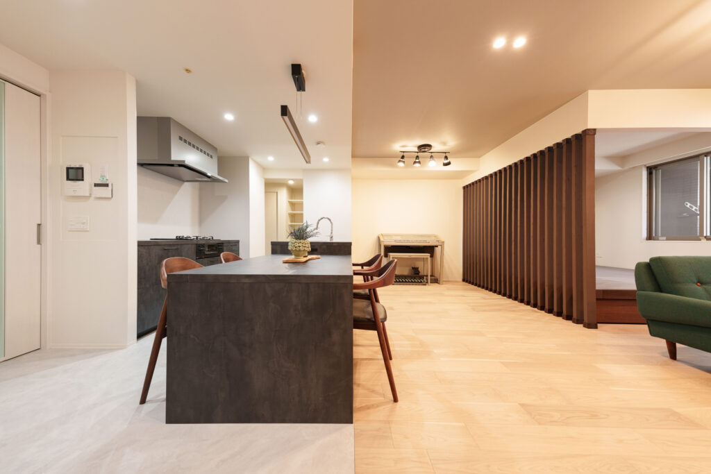 使わなくなった子ども部屋と和室をリビングに取り込み、3LDKからゆとりのある1LDKへとリノベーションを行いました。