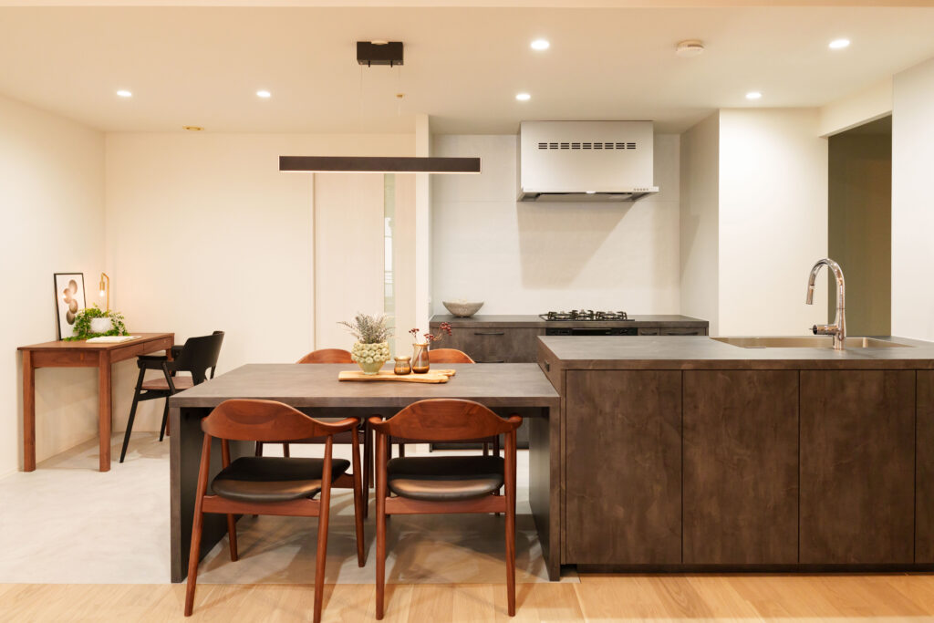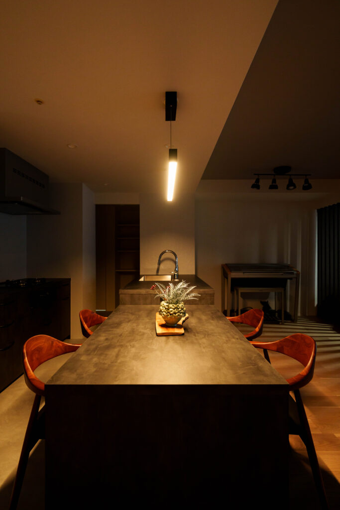 照明を落としたダイニング。陰影が空間に広がり落ち着いた雰囲気です。