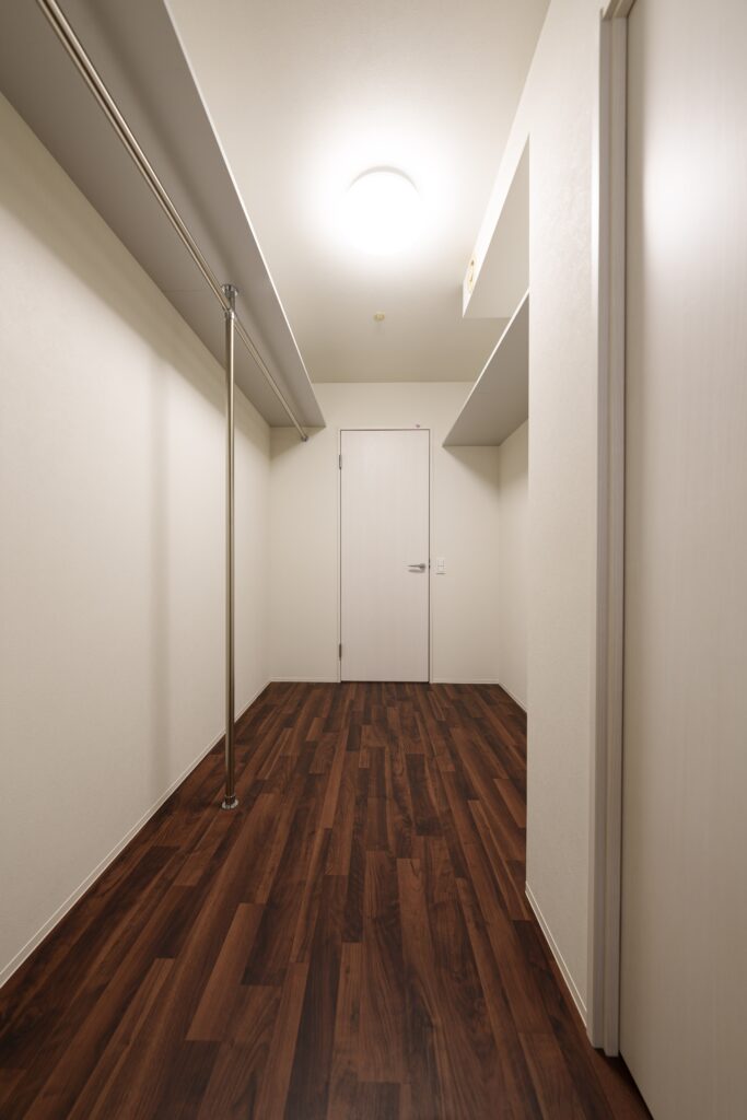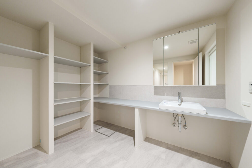 生活動線に合わせた収納スペースと通路の役割を兼ね、家事や身支度の時間の短縮に。