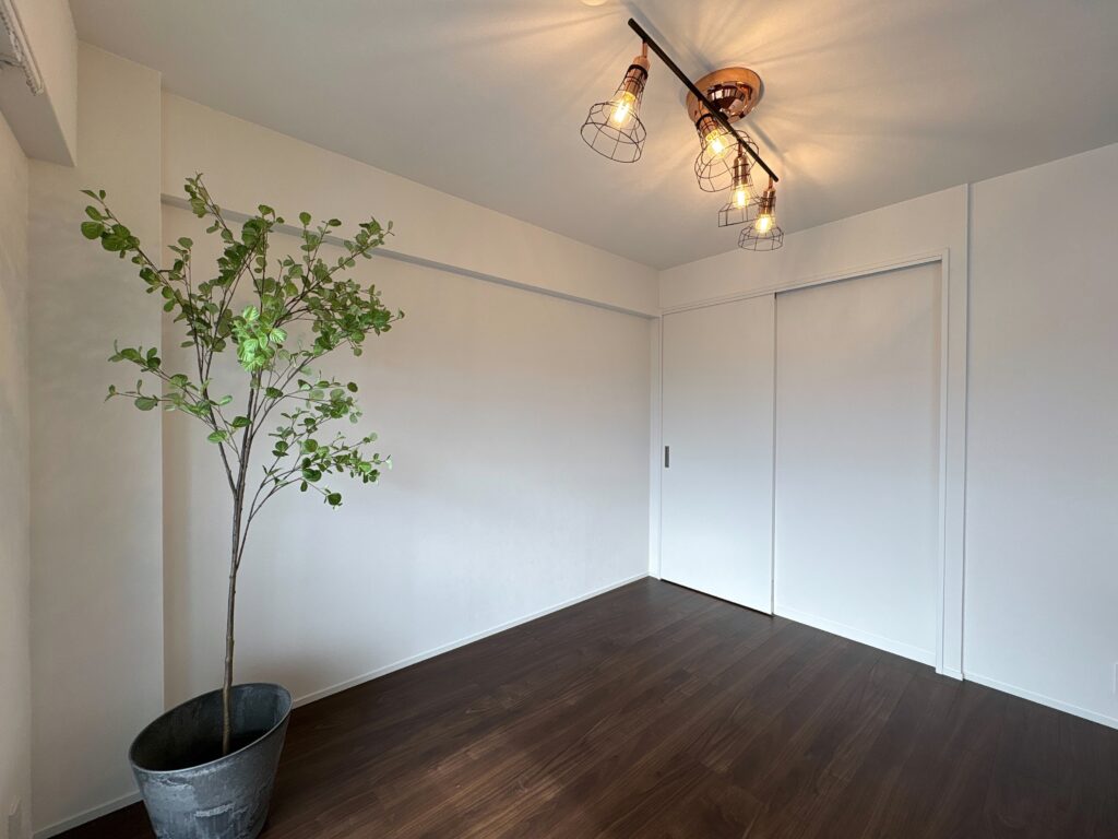 キッチンのタイル調クロス、寝室のアクセントクロス、ダウンライトやダクトレール照明、木のドアなど、シンプルながらも上質さを感じられる要素を丁寧に重ねました。